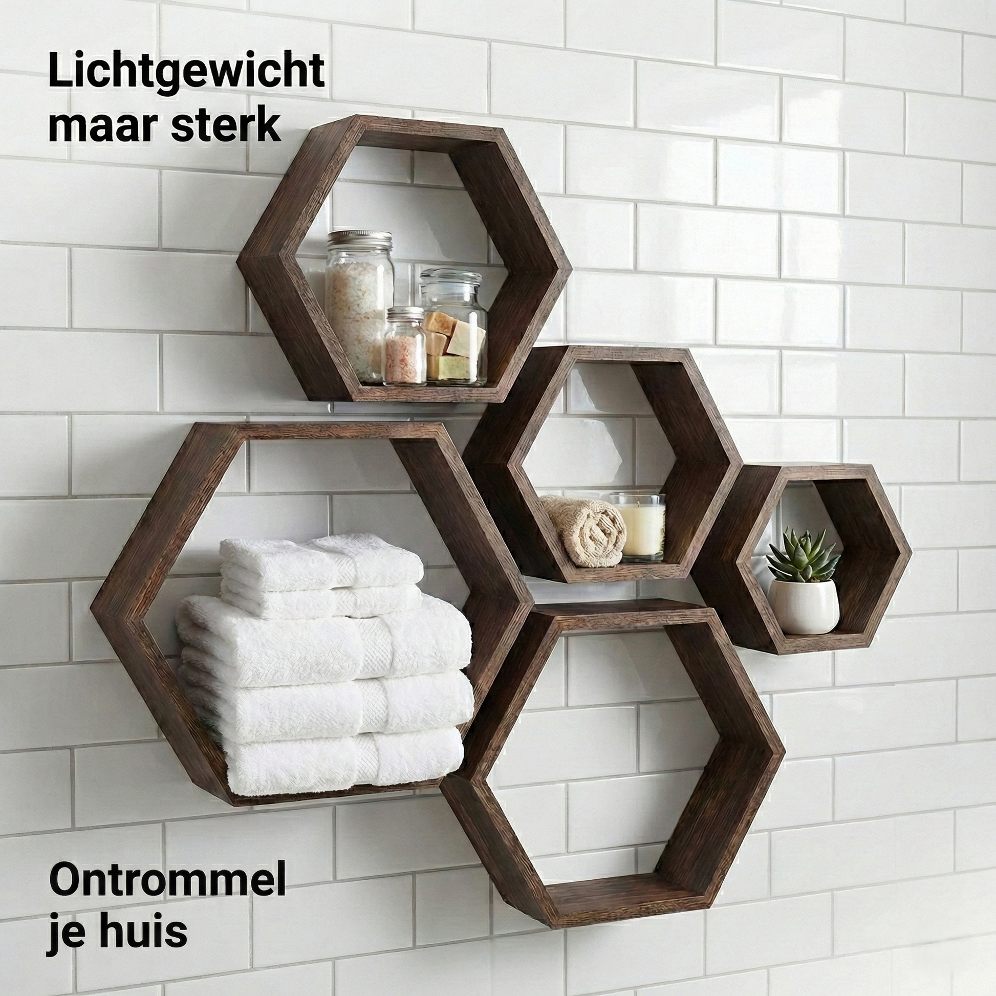 Of je nu een industriële woonkamer, een landelijke slaapkamer of een moderne hal hebt; deze zeshoekige wandplanken zijn de blikvanger in elke ruimte. Dankzij de set van 5 verschillende formaten heb je eindeloze mogelijkheden om je eigen creatieve patroon op de muur te creëren.