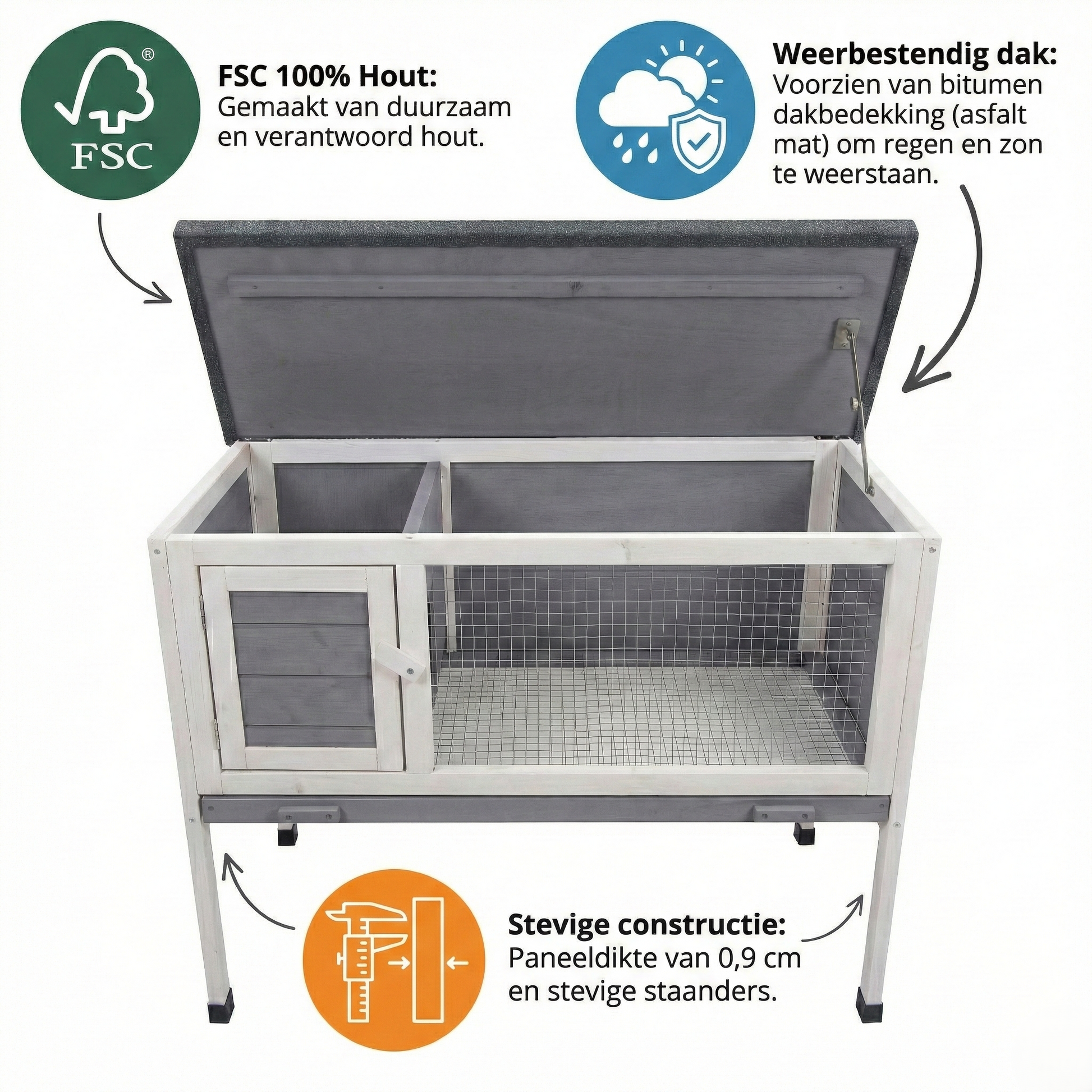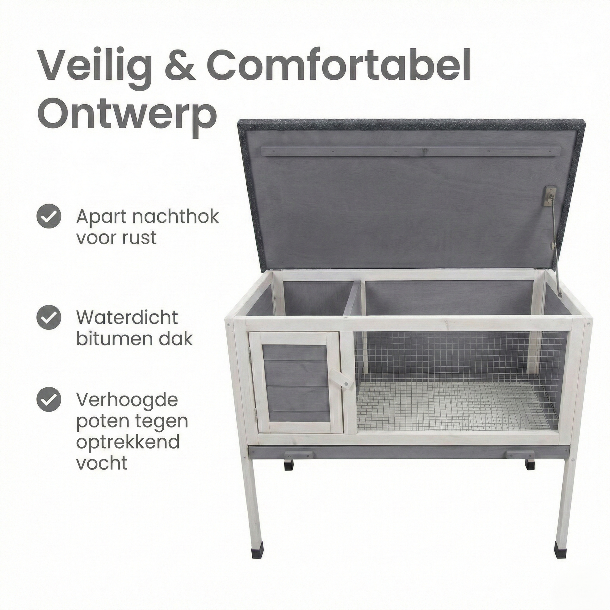 Het ontwerp van het hok bevat een openklapbaar dak en een uitschuifbare lade, wat het schoonmaken eenvoudig maakt. Het hok biedt gescheiden ruimtes voor zowel het leef- als rustgedeelte van je konijn, en de afwerking is met een diervriendelijke, niet-giftige lak.