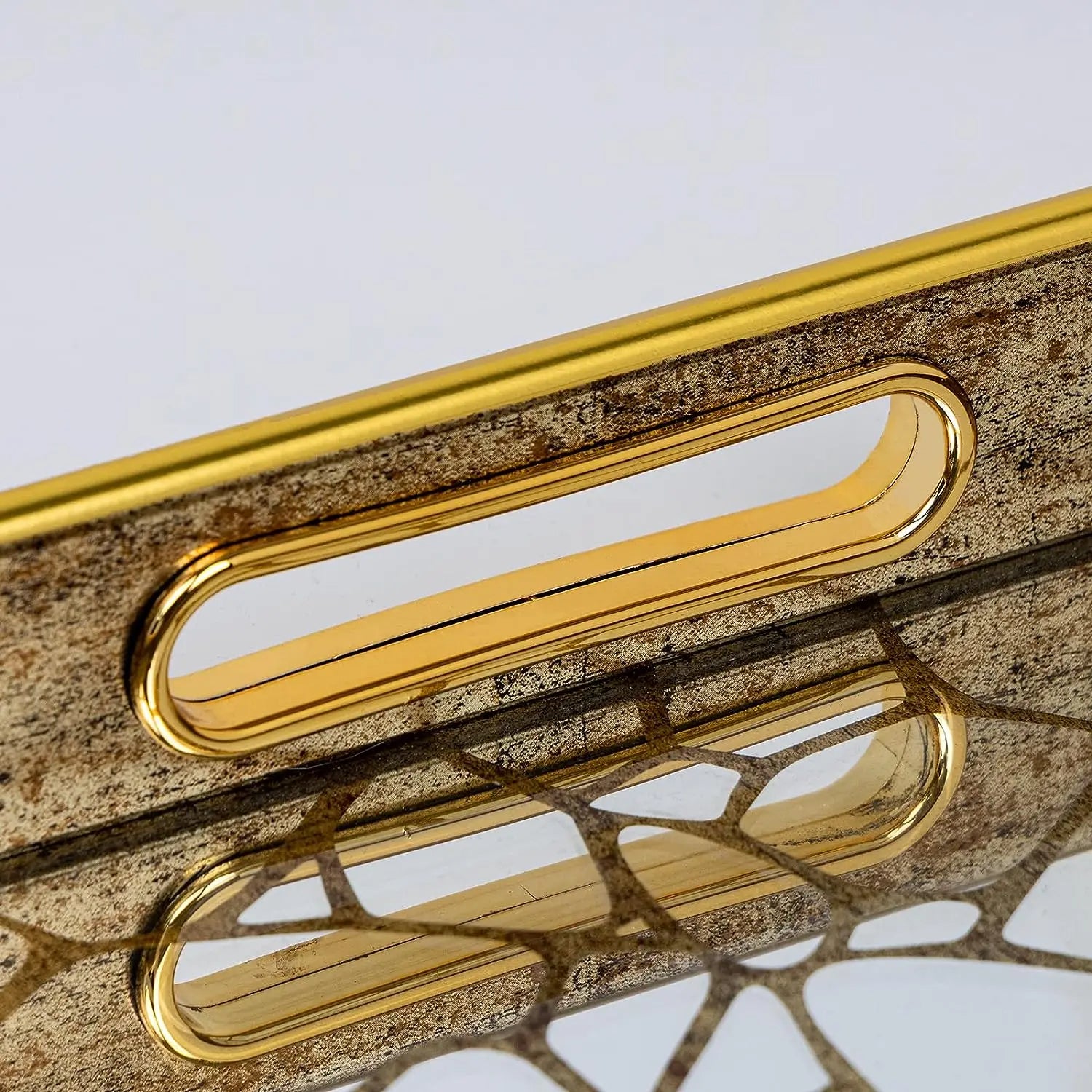 • Luxe Art Deco Design: Het goudkleurige frame en de gespiegelde bodem met geometrisch patroon zorgen voor een exclusieve uitstraling. Het licht weerkaatst prachtig in het glas, waardoor je accessoires extra opvallen.