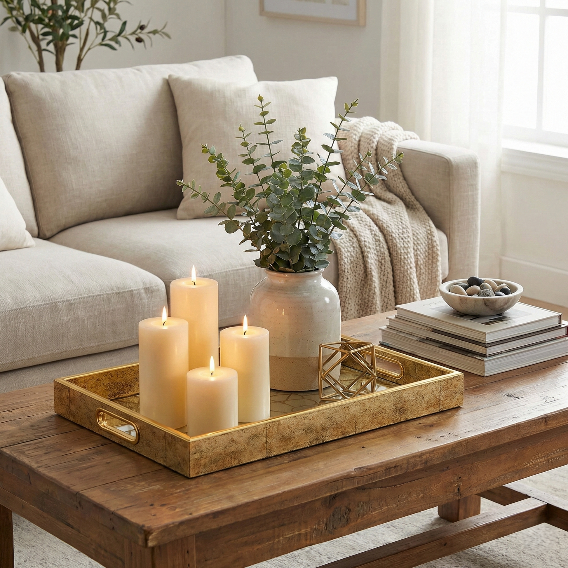 1. Salontafel styling: Plaats er kaarsen, een vaasje bloemen en een mooi koffietafelboek op.